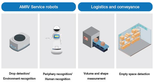 自主機(jī)器人不僅被用于工業(yè)應(yīng)用,如工廠和配送倉(cāng)庫(kù)的運(yùn)輸,還應(yīng)用于公共設(shè)施、醫(yī)院、火車站和商業(yè)綜合體。除了簡(jiǎn)單的任務(wù),如運(yùn)輸,包括手臂應(yīng)該使機(jī)器人從事更高級(jí)的任務(wù),如組件組裝。在這種多變的環(huán)境中,三維視覺傳感器能夠準(zhǔn)確地檢測(cè)周圍環(huán)境,以避開人、障礙物和不平的表面,從而實(shí)現(xiàn)機(jī)器和設(shè)備的自主操作。然而,傳統(tǒng)應(yīng)用中使用的攝像機(jī)和2D激光雷達(dá)的探測(cè)范圍有限,需要多個(gè)設(shè)備的組合,這就帶來了復(fù)雜結(jié)構(gòu)的挑戰(zhàn)。