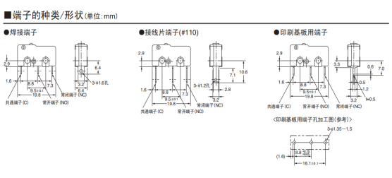 2、微動開關外形尺寸和端子的種類也是很重要: