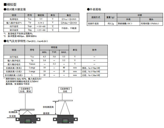 以上兩種光電傳感器有一個缺陷,即當(dāng)碰到透明物質(zhì)和液體時,紅外線直接穿過相關(guān)物體,這就造成了槽式光電傳感器無法產(chǎn)生阻斷效果,反射式光電傳感器無法折射。為此,歐姆龍專門推出一款限定反射式光電傳感器如下: