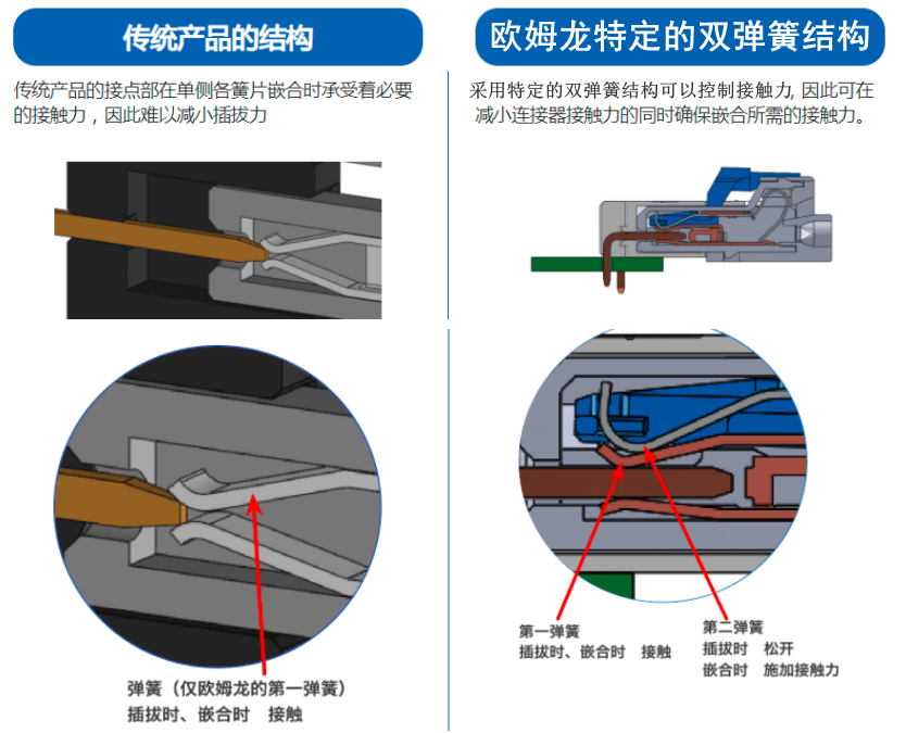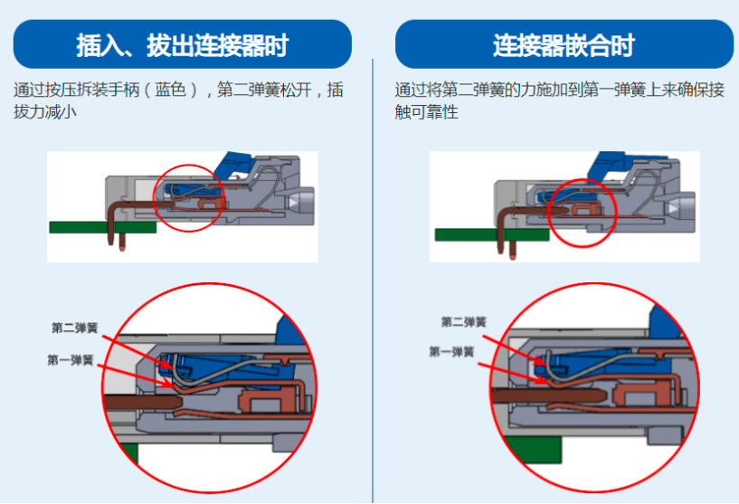 特征1其特點雙彈簧結(jié)構(gòu)在嵌合時通過第一彈簧和第二彈簧的接觸合力確保接觸可靠性,并在插拔時通過操作手柄打開第二彈簧來減小插拔力。如下圖