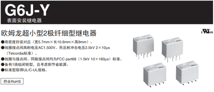 特點:歐姆龍近年來的新系列繼電器,線圈與接點間、同極接點間均為FCC part68(1.5kV 10×160μs)標準。且交貨期短,是一款高性價比之選。
