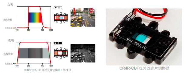 IR-CUT 或者ICR Filter中文名為紅外濾光片切換器, 或紅外截止濾光片,是所有紅外監(jiān)控攝像頭必備的一個小部件,此部件位于鏡頭和圖像傳感器的中間,紅外濾光片主要包括濾光片和驅(qū)動線圈組成。每當(dāng)監(jiān)控攝像頭進行日夜切換時,IR CUT將動作,用戶常常會聽到“滴”的切換聲。那到底IR CUT工作原理是什么? 有什么用呢?