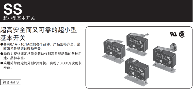 在體外診斷儀器的研發(fā)生產(chǎn)中,必定離不開(kāi)一種重要組成零件,那就是開(kāi)關(guān)。開(kāi)關(guān)可在需頻繁換接電路的設(shè)備中進(jìn)行自動(dòng)控制及安全保護(hù),廣泛應(yīng)用在各式儀器儀表設(shè)備中,開(kāi)關(guān)雖小,起的作用卻是不可替代的。像歐姆龍的SS超小型基本開(kāi)關(guān)系列,不僅規(guī)格齊全,從0.1A~10.1A均有配備,而且機(jī)械壽命長(zhǎng),最高可達(dá)3000萬(wàn)次,深受診斷儀器生產(chǎn)廠(chǎng)商的喜愛(ài)。廣州鼎悅電子科技有限公司專(zhuān)業(yè)代理歐姆龍微動(dòng)開(kāi)關(guān)SS-5GL,傳感器等;歡迎電話(huà)咨詢(xún)廣州鼎悅電子科技有限公司;相信我們可以帶給您不一樣的選擇;如圖: