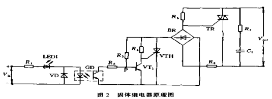 這里僅以應(yīng)用較多的交流過零型固體繼電器為例,介紹其工作原理。該電路采用了過零觸發(fā)技術(shù),具有電壓過零時(shí)開啟,負(fù)裁電流過零時(shí)關(guān)斷的特性,在負(fù)載上可以得到一個(gè)完整的正弦波形,因此電路的射頻干擾很小。該 電路由信號輸人電路、零電壓檢測控制電路、工作指示電路、雙向晶閘管控制電路和吸收電路幾部分組成。采用了光電耦合器GD作為輸入電路和輸出電路之間的隔離元件,VD是防止Vin正負(fù)接反燒壞GD。