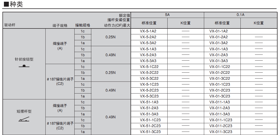 ? 從微小負(fù)載到5A型品種豐富多樣,和V系列小型基本 開關(guān)形狀相同。