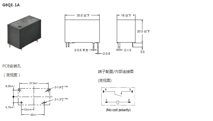 | 印刷基板用端子 | 標(biāo)準(zhǔn)型 | SPST-NO (1a) | 耐助焊劑 | G6QE-1A |